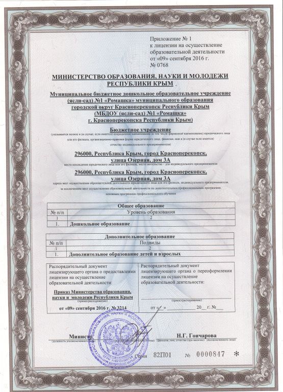 | Полное наименование образовательной организации* | МУНИЦИПАЛЬНОЕ БЮДЖЕТНОЕ ДОШКОЛЬНОЕ ОБРАЗОВАТЕЛЬНОЕ УЧРЕЖДЕНИЕ (ЯСЛИ-САД) №1 "РОМАШКА" МУНИЦИПАЛЬНОГО ОБРАЗОВАНИЯ ГОРОДСКОЙ ОКРУГ КРАСНОПЕРЕКОПСК РЕСПУБЛИКИ КРЫМ |